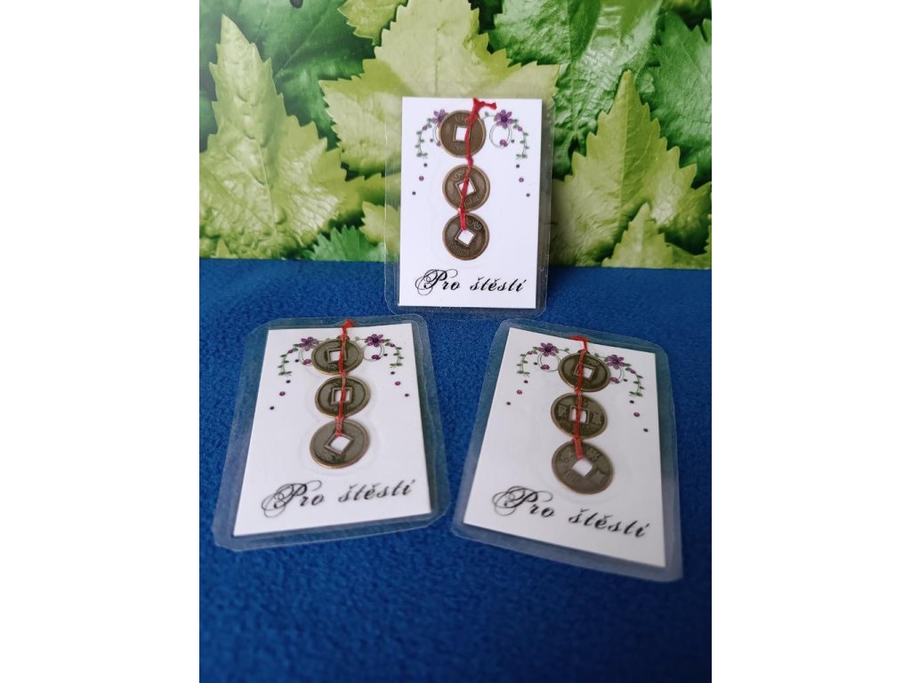 Tři čínské mince na červené šňůrce na kartičce s nápisem Pro štěstí. Laminováno nebo v celofánovém sáčku dle skladových zásob.