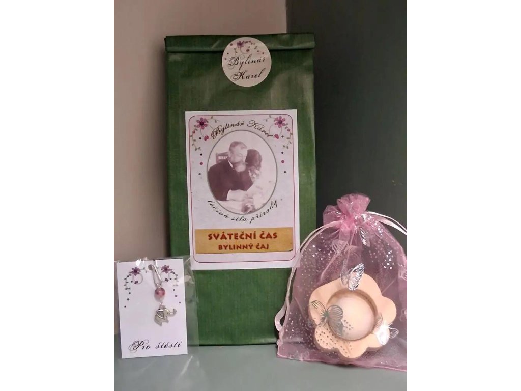 Balíček Sváteční klid a štěstí je ideální vánoční dárek – spojuje bylinný čaj, aroma stojánek a talisman pro radost, pohodu a klid od stresu.