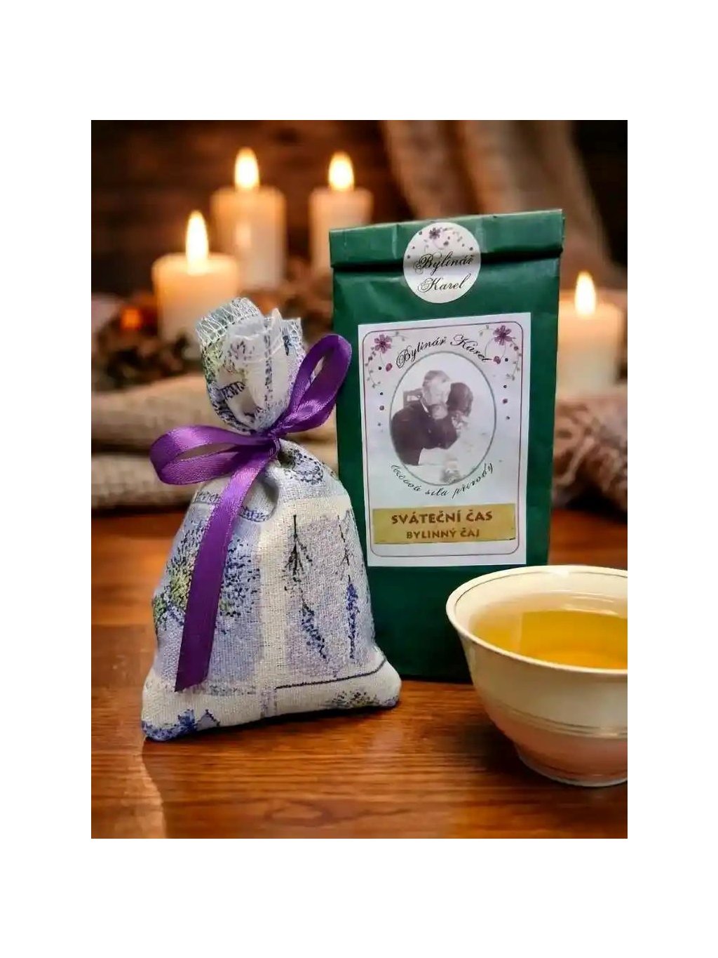 🍵 Bylinný čaj „Sváteční čas“ (50 g): Směs pečlivě vybraných bylin od Bylináře Karla, která navozuje sváteční atmosféru s příjemnou vůní a chutí. Složení zahrnuje čekanku, maliník, ostružiník, meduňku, vřes, mateřídoušku a růži. Tento čaj podporuje:
