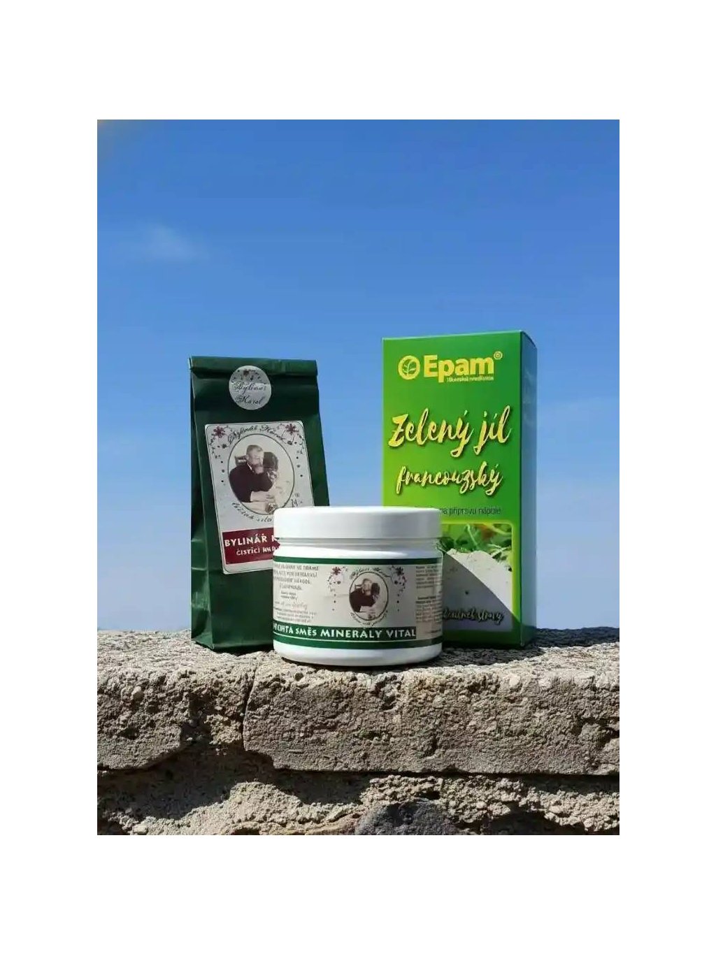 Doplněk stravy: bylinný čaj Bylinářské koště 50 g, Zásaditá minerální směs VITAL 300 g na přípravu ochuceného nápoje a Francouzský zelený jíl 170 g na přípravu nápoje.
