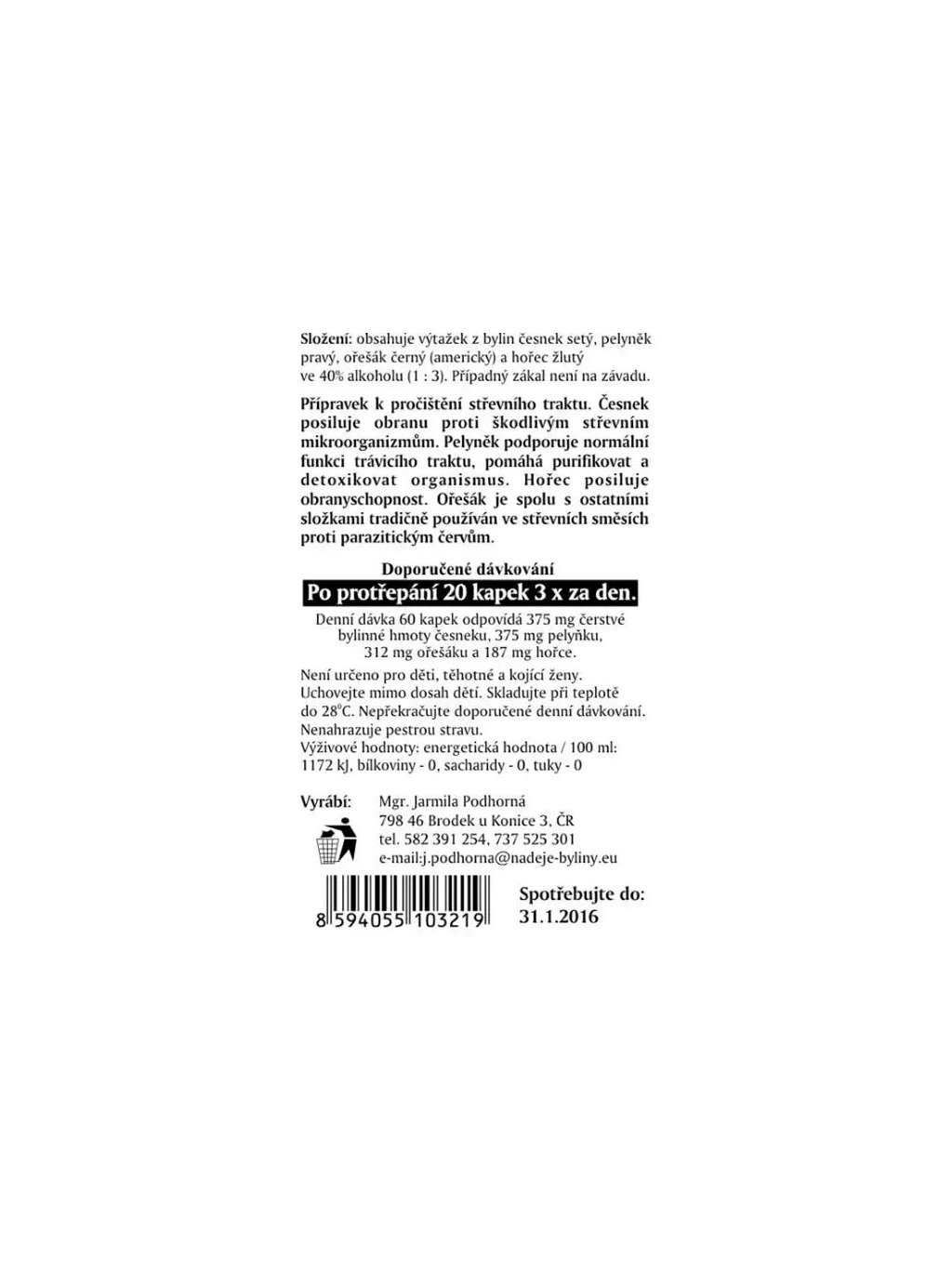 Směs bylin: česnek medvědí, česnek setý, pelyněk, hořec žlutý, ořešák americký (pupen) Tinktura z bylin • 50 ml 🌿 Doplněk stravy – tinktura s obsahem 40 % alkoholu (ethanolu)