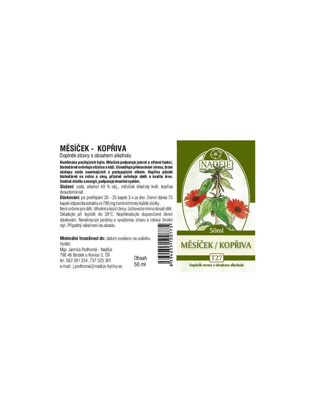 Měsíček a kopřiva jsou tradičně užívané byliny podporující pokožku, imunitu, trávení, dýchací systém, vylučování vody, vitalitu, těžké nohy a klouby. Tinktura ve 40% ethanolu nabízí jednoduché a praktické užívání.