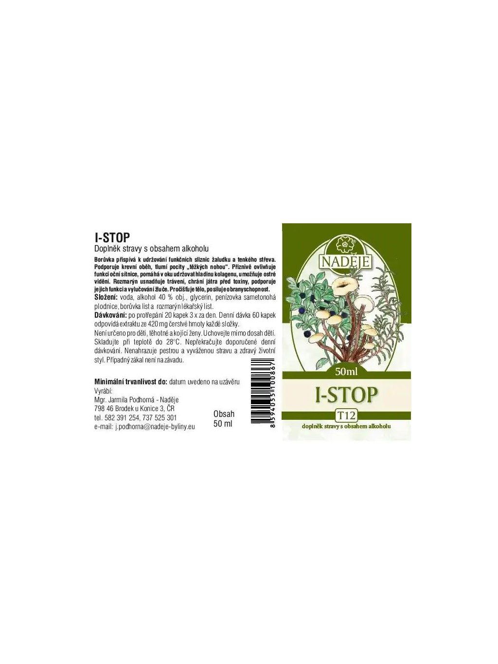 I‑stop je bylinná tinktura , která přispívá k normálnímu trávení, osvěžení těla, přirozené obranyschopnosti, správné funkci jater a žlučových cest, vylučovacích procesů včetně ledvin a močových cest. Podporuje také zrak, kosti, kardiovaskulární soustavu a metabolismus glukózy, lipidů a bílkovin.