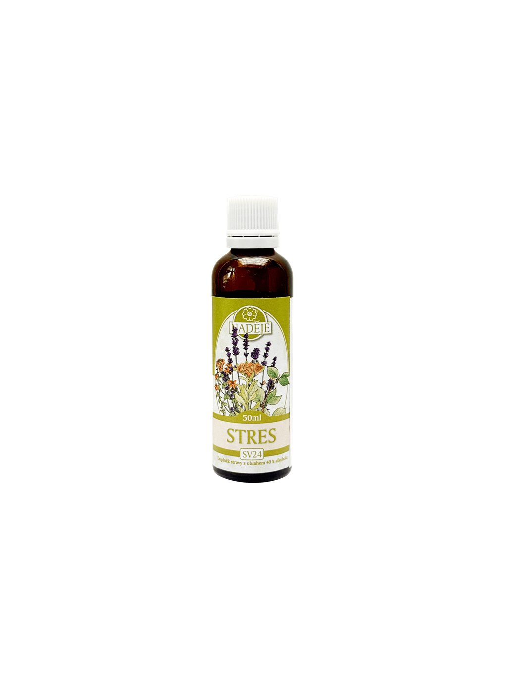 Stres je směs tradičně užívaných bylin – eleuterokoku, klanoprašky, třezalky, mučenky, rozchodnice a levandule. Tinktura ve 40% ethanolu podporuje přirozené procesy organismu a je zaměřená na duševní pohodu, emoční rovnováhu, relaxaci a celkovou odolnost vůči zátěži.