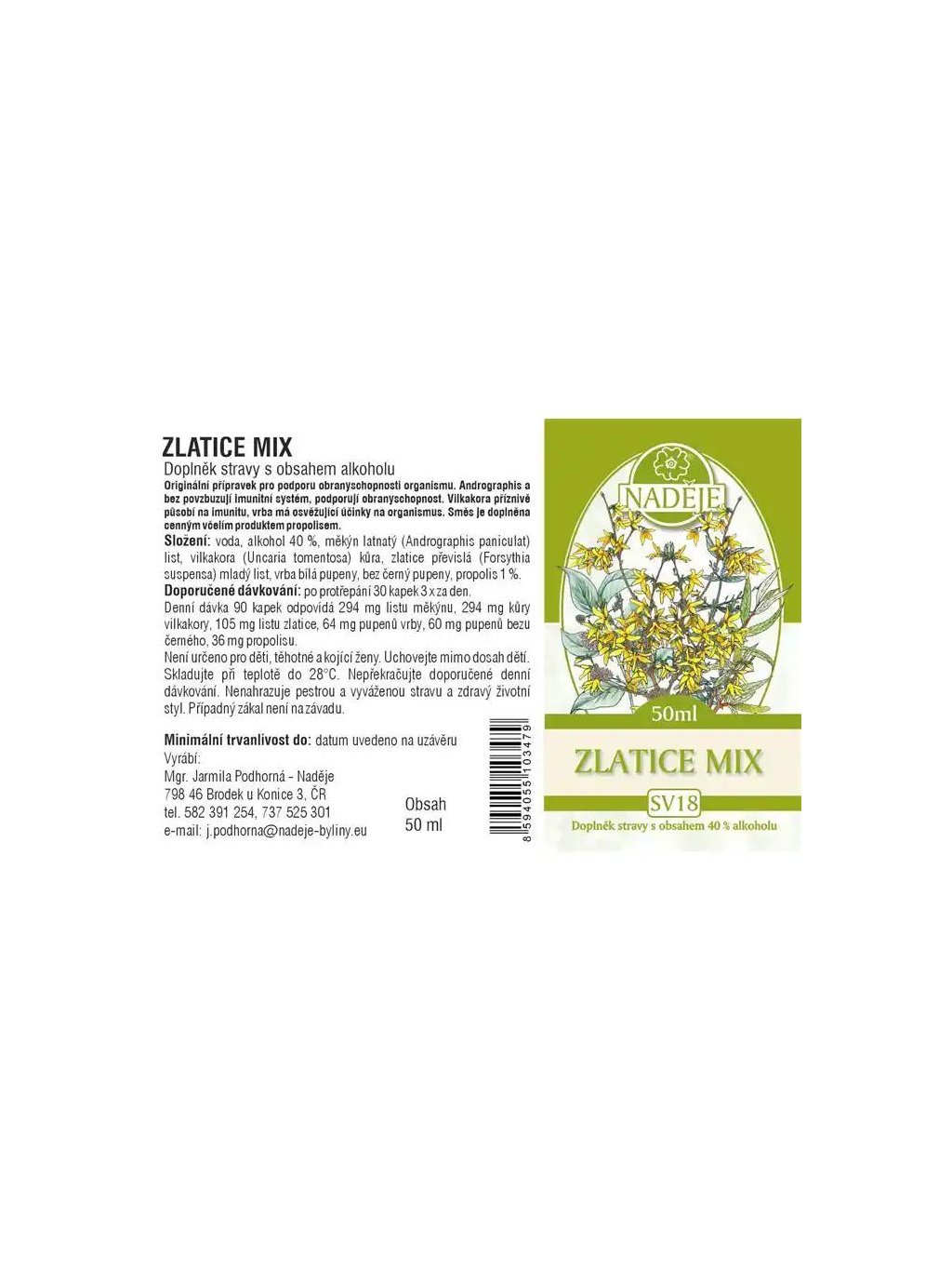 voda, alkohol 40%, měkýn latnatý( andrographis paniculat list), vilcacora (uncaria tomentosa) kůra, zlatice převislá( forsythiasuspensa) mladý list, vrba bílá pupeny, bez černý pupeny, propolis 1%.