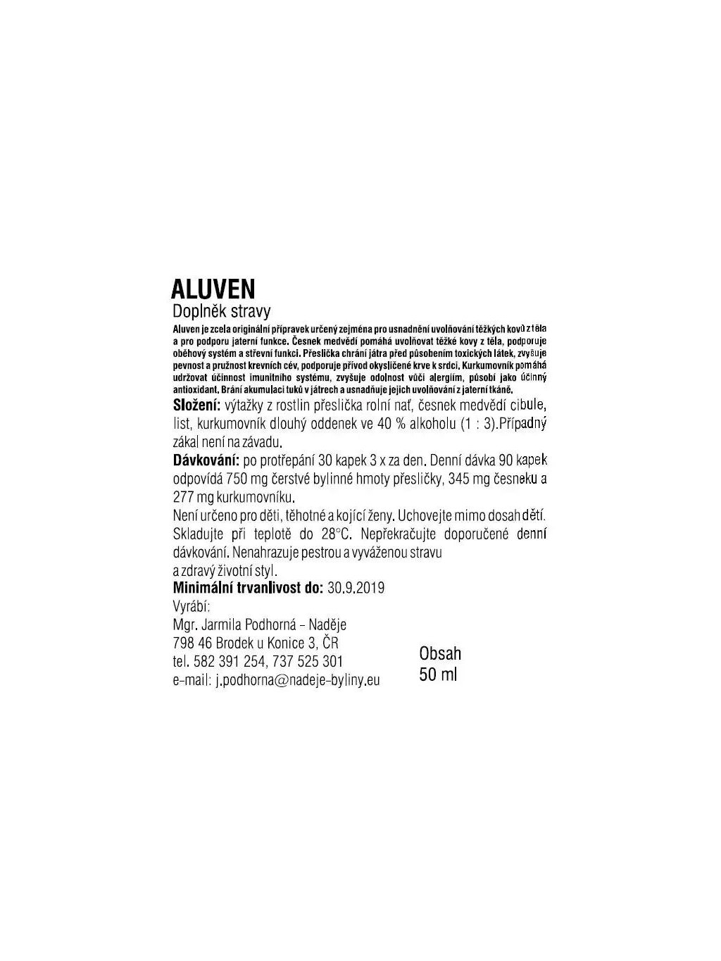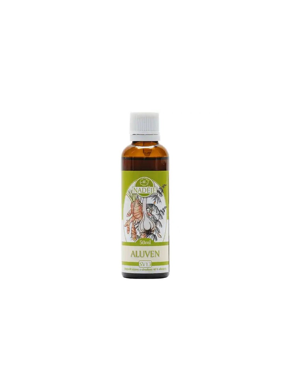 Aluven je doplněk stravy ve formě tinktury s obsahem 40% alkoholu. Obsahuje výtažky z medvědího česneku, přesličky rolní a kurkumy dlouhé – byliny tradičně využívané pro podporu normálních funkcí jater, oběhové soustavy, trávení a imunity.