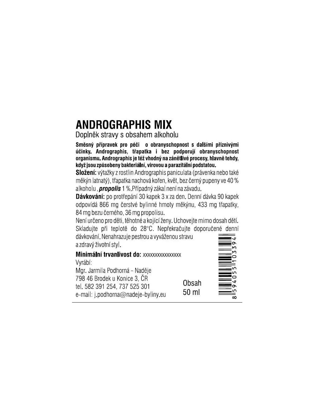 Andrographis mix je bylinná tinktura obsahující právenku (měkýn latnatý), třapatku nachovou, pupen bezu černého a propolis. Směs tradičně užívaných bylin podporuje přirozené procesy organismu a nabízí praktickou formu užívání ve 40% ethanolu.