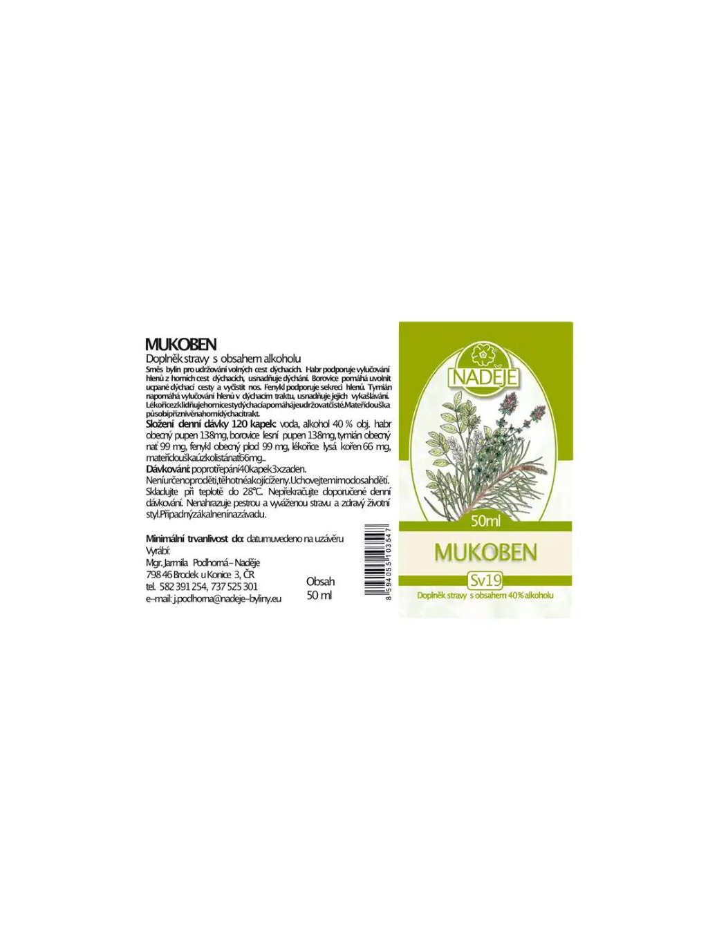 Mukoben je bylinná směs tradičně užívaných bylin – habru, borovice, tymiánu, fenyklu, lékořice a mateřídoušky. Kombinace těchto bylin je zaměřená na oblasti uvedené na on‑hold seznamu, zejména dýchací systém, imunitu, trávení a přirozené očistné procesy organismu.