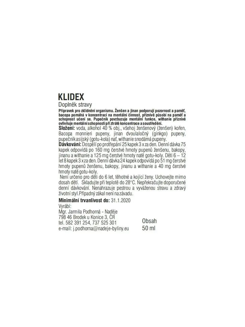 Klidex je směs tradičně užívaných bylin – ženšenu, bacopy, jinanu, gotu koly a withánie. Tinktura ve 40% ethanolu podporuje přirozené procesy organismu a je zaměřená na duševní rovnováhu, kognitivní funkce, vitalitu a celkovou odolnost.